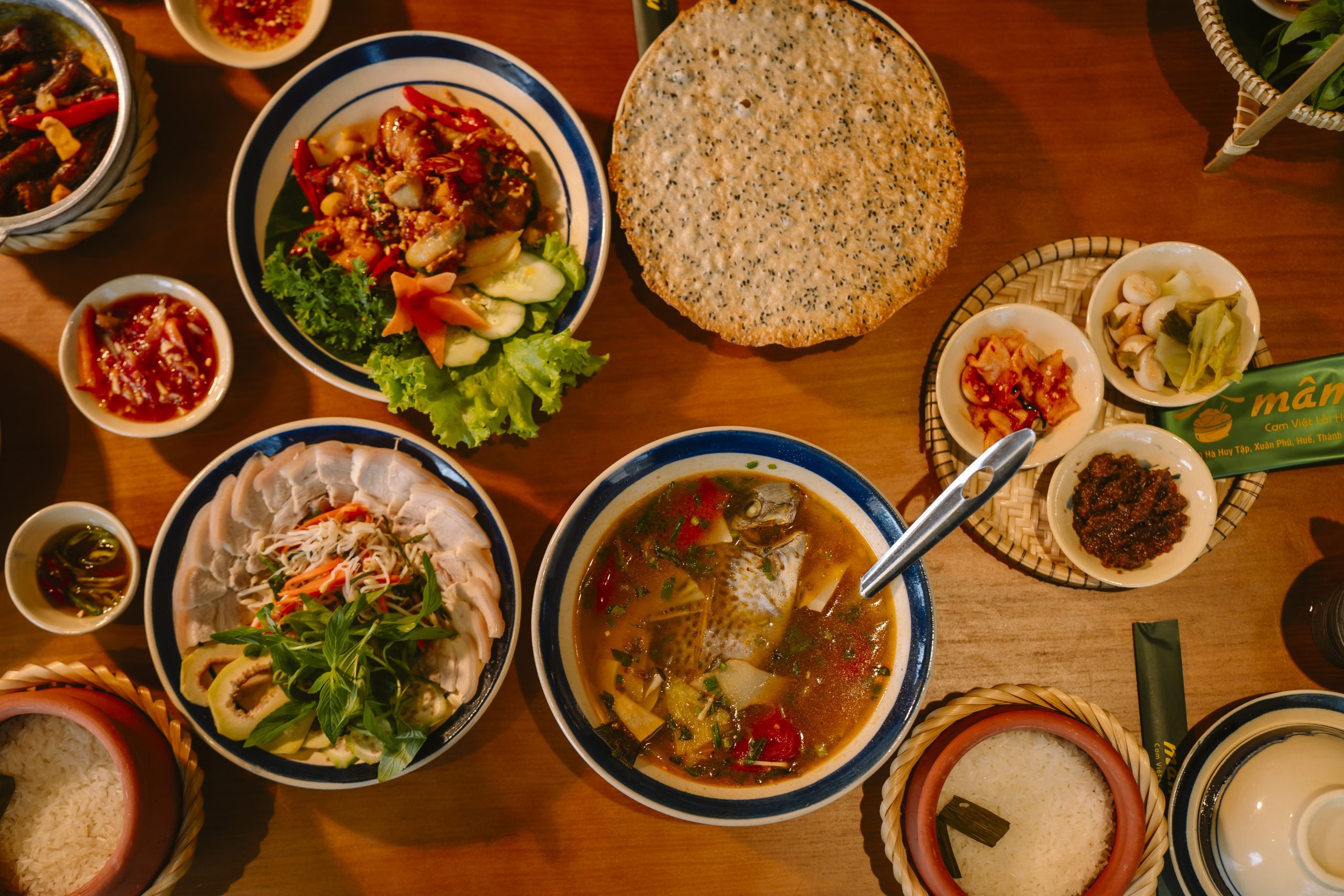Sự mộc mạc: Những đĩa rau luộc xanh mướt, nồi cơm niêu thơm mùi khói mới hay bát canh ngọt thanh vị đồng nội.